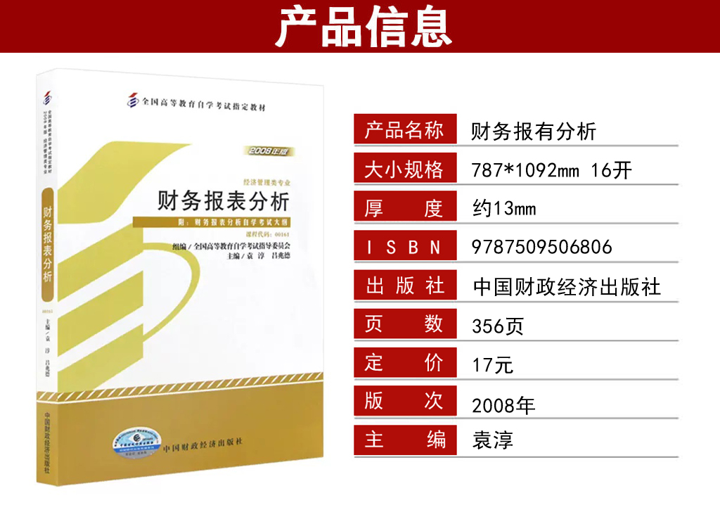 財務(wù)報表分析或財務(wù)報表分析(一)自考教材課程代碼是00161,是由中國財政經(jīng)濟(jì)出版社出版,出版時間為2008年,由袁淳主編。本書自帶考試大綱,重點(diǎn)難點(diǎn)分析。自考財務(wù)報表分析00161教材,自考財務(wù)報表分析00161考試大綱,財務(wù)報表分析00161電子版教材,自考財務(wù)報表分析00161歷年真題...