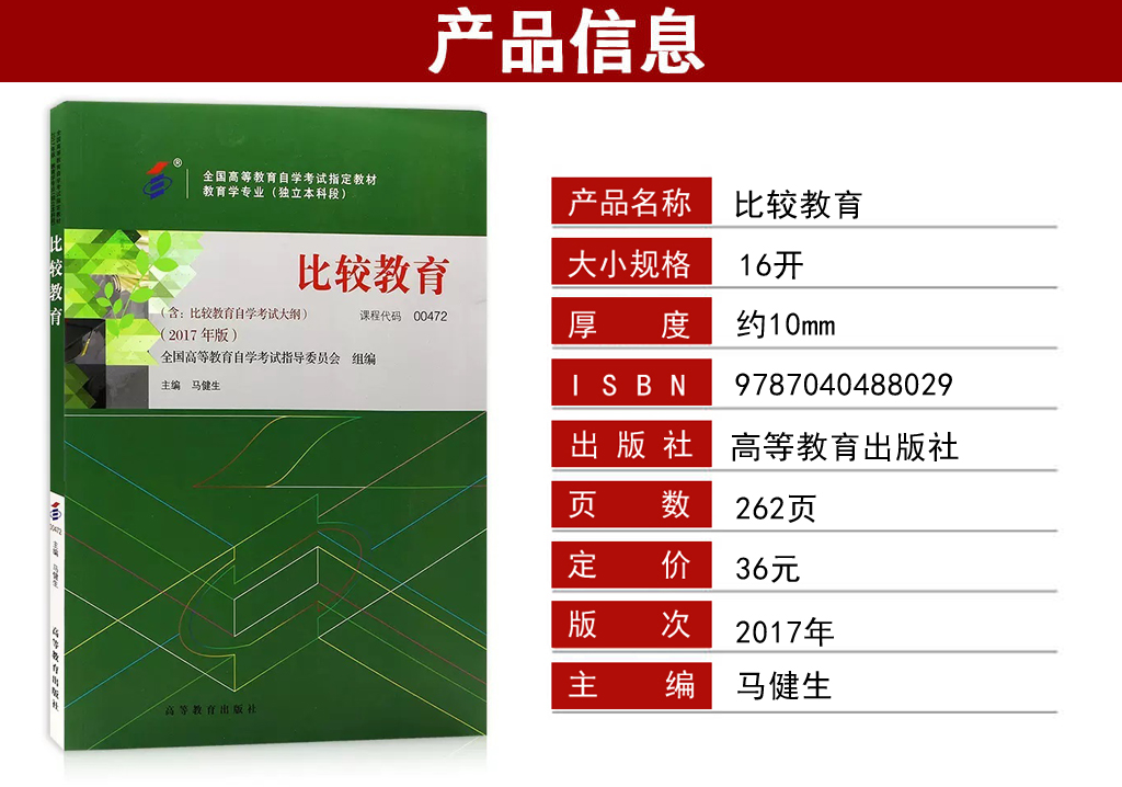 一、教材介紹比較教育自考教材課程代碼是00472,是由高等教育出版社出版,出版時(shí)間為2017年,由馬健生主編。本書自帶考試大綱,重點(diǎn)難點(diǎn)分析。二、教材目錄自考比較教育00472教材,自考比較教育00472考試大綱,比較教育00472電子版教材,自考比較教育00472歷年真題...