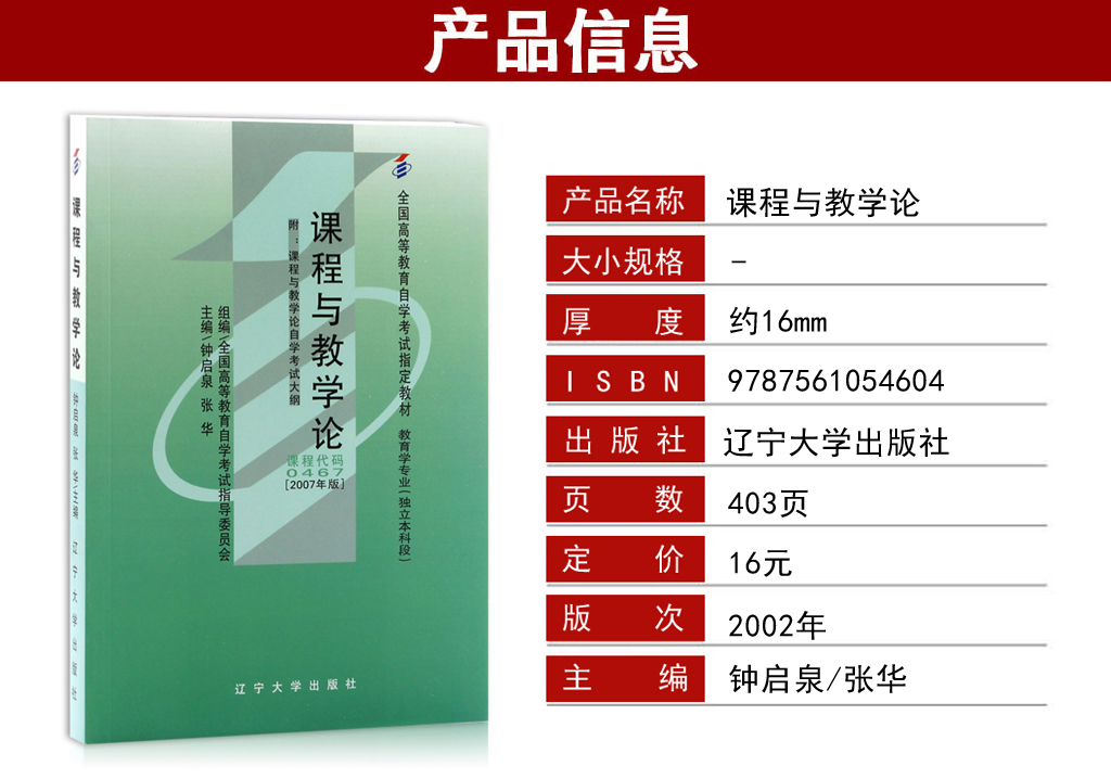 一、教材介紹課程與教學(xué)論自考教材課程代碼是00467,是由遼寧大學(xué)出版社出版,出版時(shí)間為2002年,由鐘啟泉、張華主編。本書自帶考試大綱,重點(diǎn)難點(diǎn)分析。二、教材目錄自考課程與教學(xué)論00467教材,自考課程與教學(xué)論00467考試大綱,課程與教學(xué)論00467電子版教材,自考課程與教學(xué)論00467歷年真題...